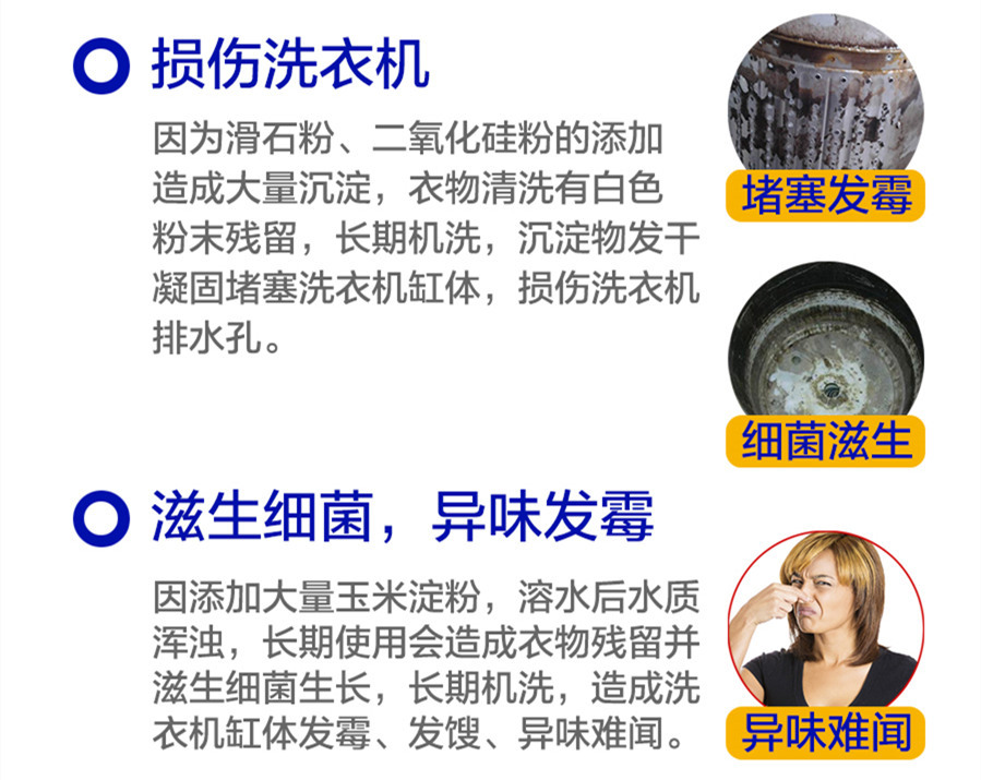 市面的渾水洗衣片,由于成本及技術(shù)問(wèn)題,添加“滑石粉、二氧化硅粉、玉米淀粉等不良物質(zhì)”,容易導致?lián)p傷洗衣機,堵塞發(fā)霉,細菌滋生,而清水洗衣片,完全解決以上問(wèn)題,使用沒(méi)有任何的副作用,是配方的再升級版。